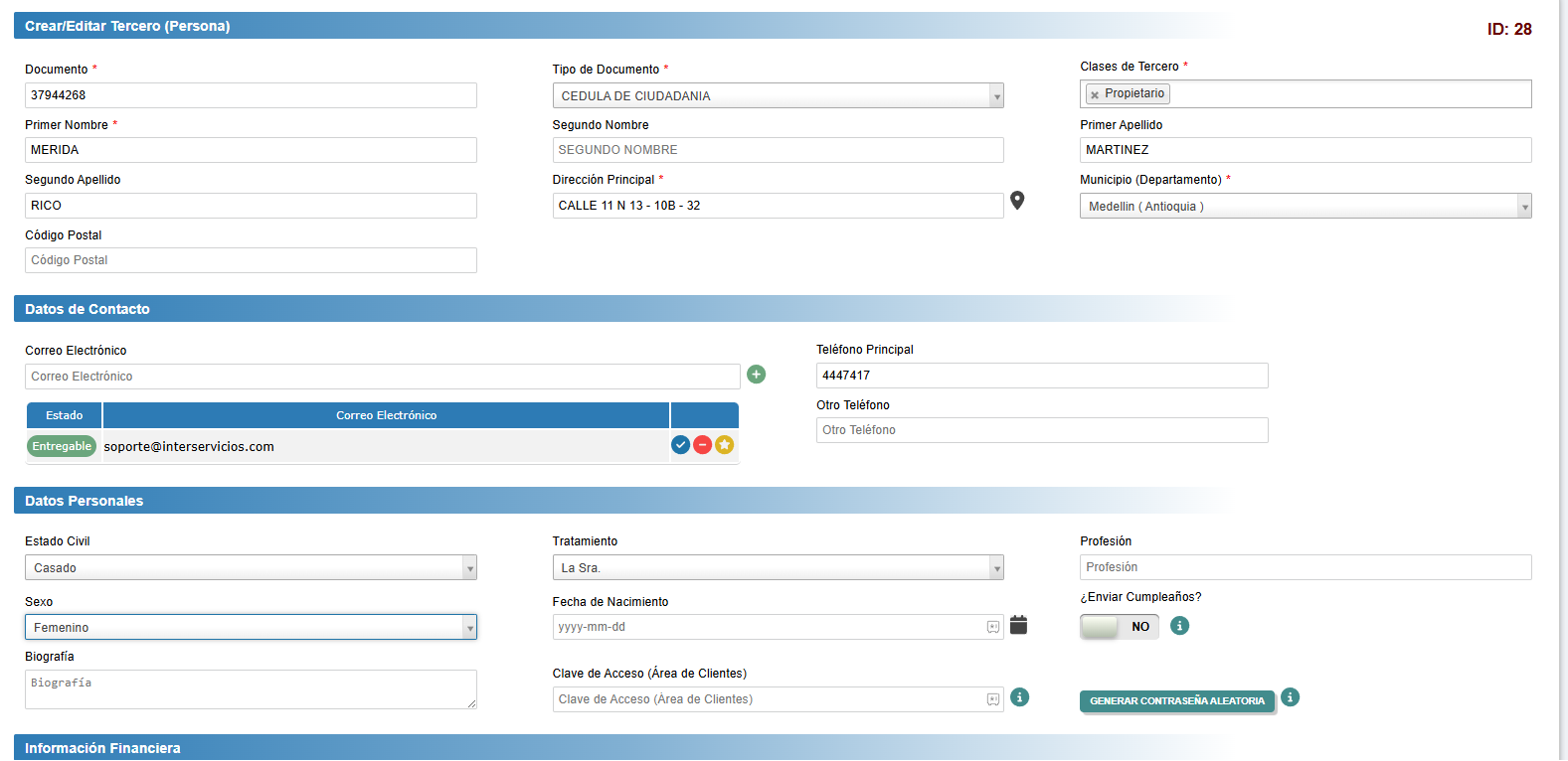 Proveedor | Para facturación manual y gestión contable. | - Datos personales: Tratamiento, sexo, fecha de nacimiento (opcional). - Información financiera: Tipo de persona, régimen, % de retención, datos bancarios. |